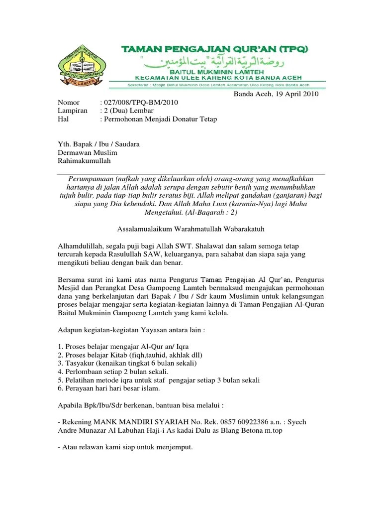 Hatinya kepada bapak/ibu sebagai donatur tetap untuk kegiatan pengajian . Surat permohonan donatur tetap formulir donatur tetap masjid baiturrohman permohonan menjadi donatur tetap.docx contoh surat permohonan . Permohonan ditujukan ke perusahaan atau perorangan; Surat permohonan donatur tetap ini memiliki format sebagai berikut : Saya yang bertandatangan di bawah ini:
